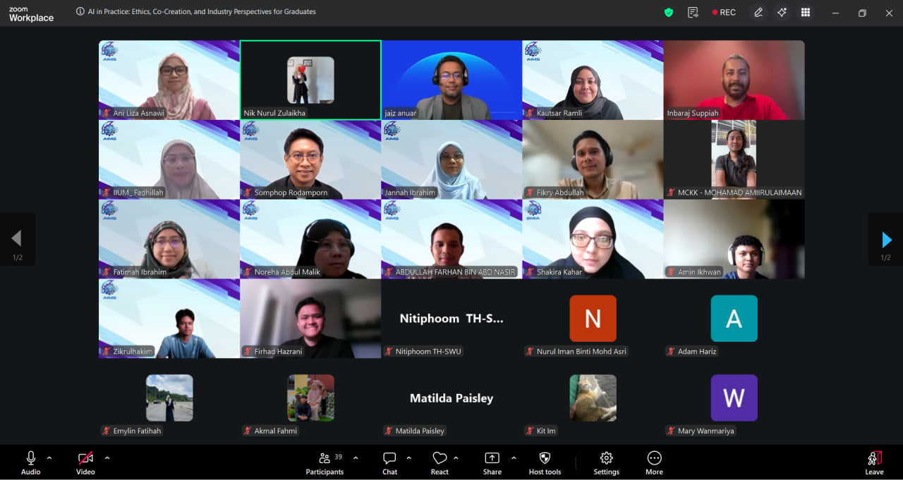 This webinar introduced the AIMS international collaboration project involving students from Malaysia, Thailand, and the United Kingdom. Industry experts shared how Artificial Intelligence is used in telecommunications, finance, and government sectors. They highlighted that AI supports decision-making but still requires human judgment and validation.